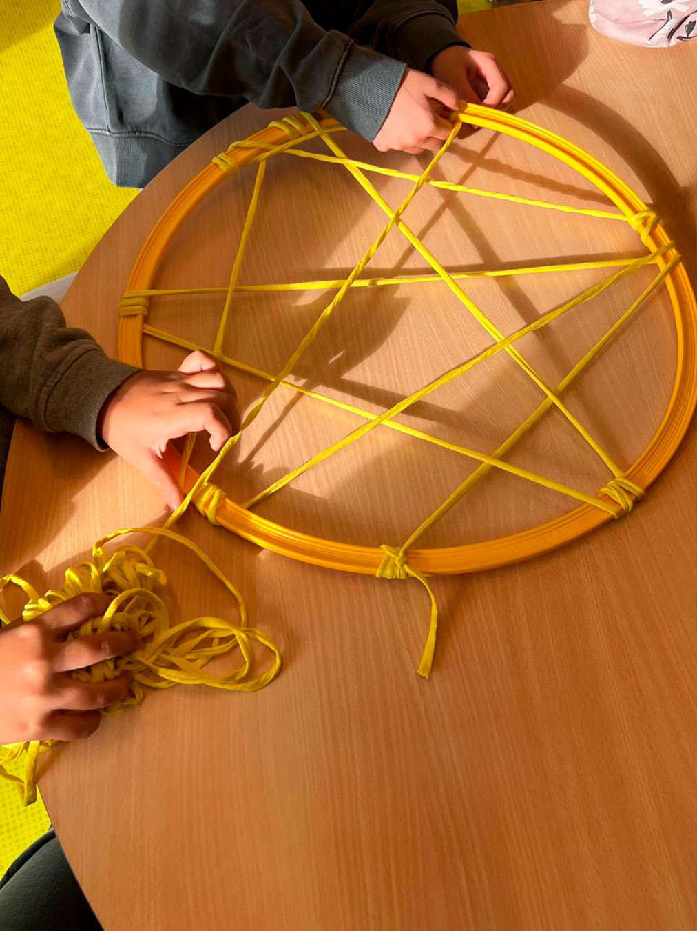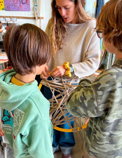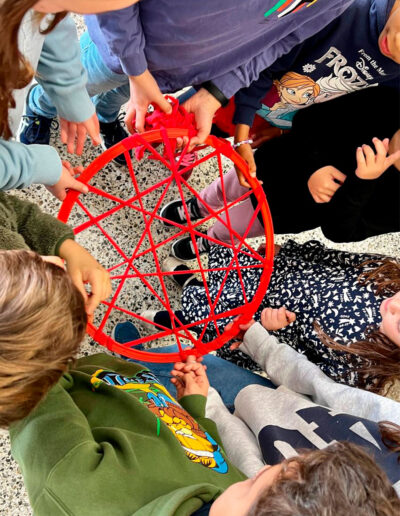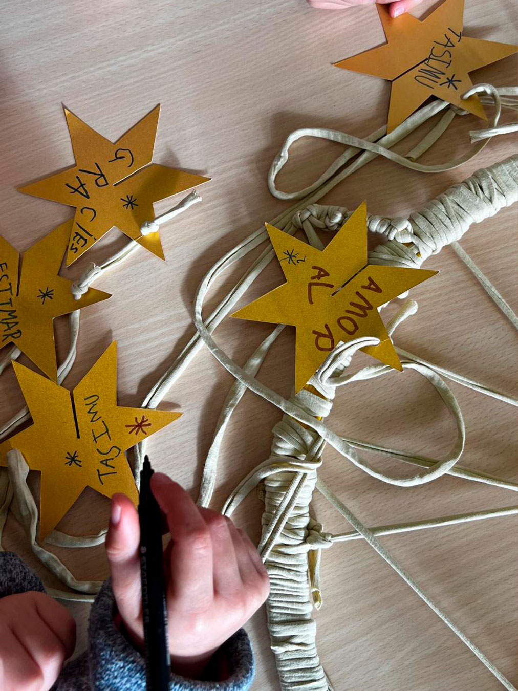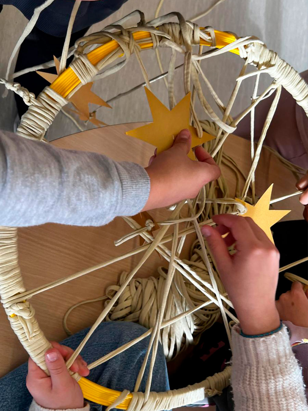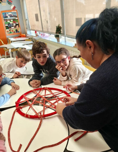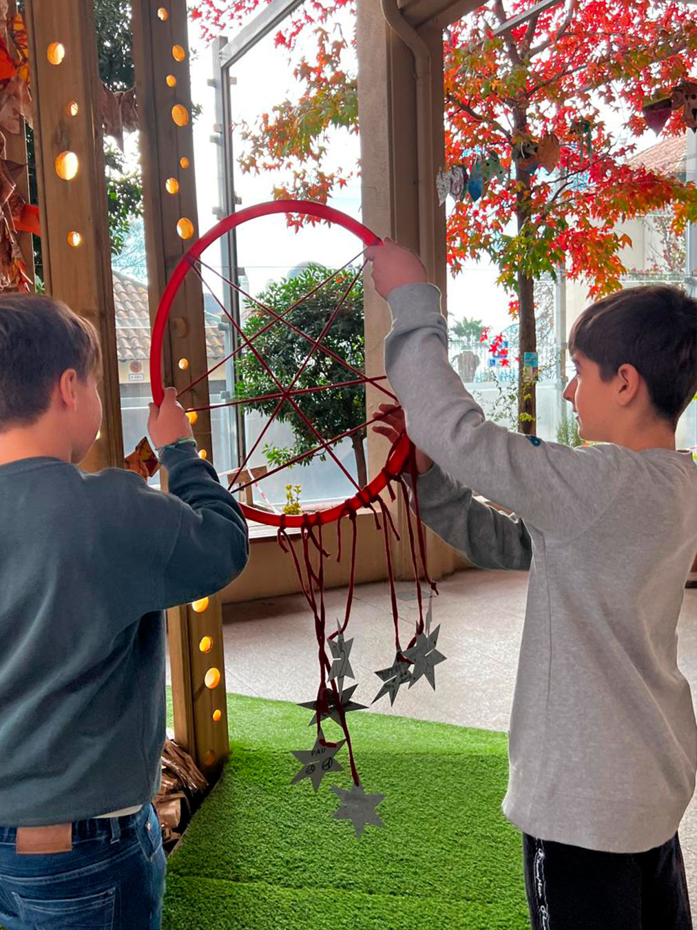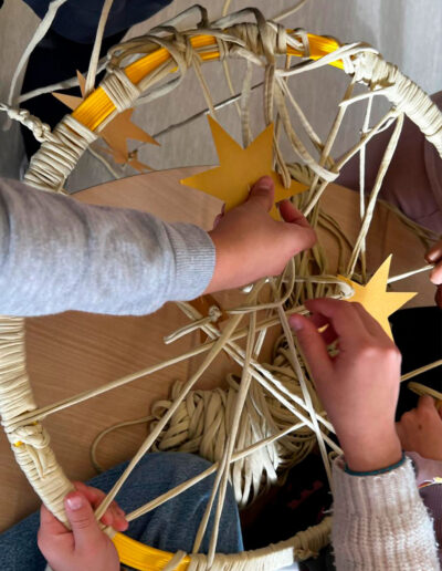 Els atrapa-somnis estan formats per cèrcols de plàstic embolcallats amb roba de colors nadalencs i amb una xarxa geomètrica senzilla al centre. A la part inferior, hi pengen estrelles on l’alumnat pot escriure missatges simbòlics, paraules d’ànim o dibuixos plens d’afecte.